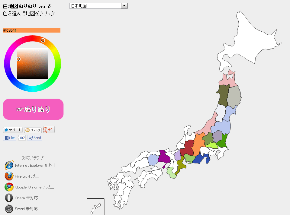 地図を選択後に好きな色を選択して、県をクリックすればその色で塗りつぶされます。